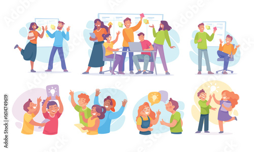 Illustrations of Dynamic Team Collaboration and Celebrations in a Vibrant Workspace Environment