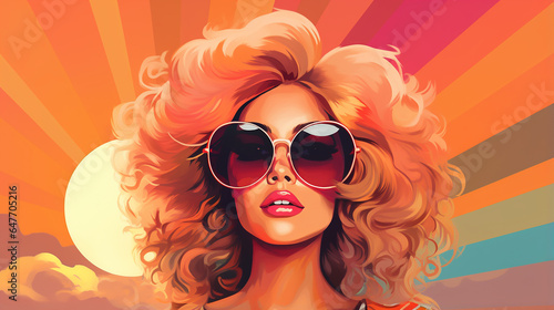 Ilustração do estilo dos anos 70 com vibrações de verão com garota fitness no pôr do sol