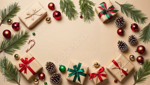 Image is a colorful, festive, holiday-themed flat lay featuring a vibrant, multicolored background adorned with Christmas decorations. Generated by Ai