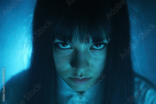 Image of a furious spirit girl with white eyes and dark hair fixating on the lens Horror movie thriller Halloween