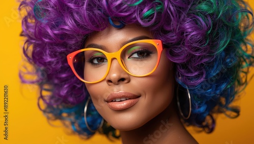 Image of an attractive woman at a carnival, wearing a wig and glasses.jpeg