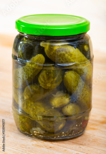 Image of glass jar with pickled cucumbers on wooden background