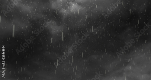 Image of heavy rain falling over lightning and stormy grey clouds background