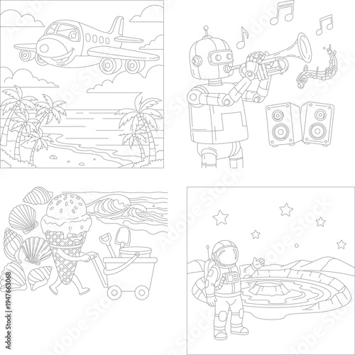 Imaginative coloring book designs: airplane, robot musician, ice cream, and astronaut on moon illustrations, tropical island