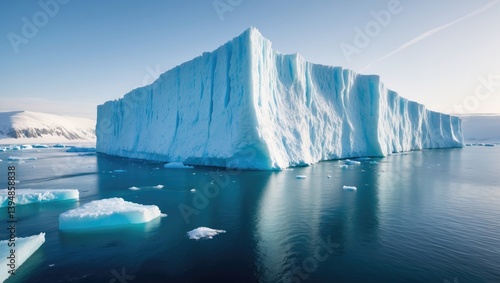 Immense glacier dominating the polar ocean. A gigantic ice wall of iceberg floats in icy waters, accompanied by mountain slopes in the background. Close-up of a winter landscape. Climate change