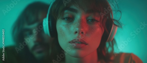 Immersive Digital Audio Experience Gen Z Content Creators in Cinematic Low-Key Lighting Exploring Modern Podcast Production with Emotional Authenticity