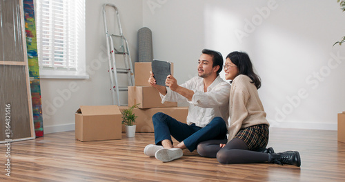 couple, man, woman, tablet, floor, apartment, flat, cyberspace, video, call, wave, chat, family, friends, smile, online, new, buy, home, move, bright, clean, room, screen, happy, love, relax, digital, modern, connection, lifestyle, light, interior, gesture, people, proud, empty, together, sitting, partner, tech, casual attire, living room, close, talk, joy, bonding, welcome, celebrate, success