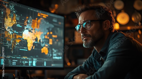 In a dark room with coins, a businessman examines financial charts on a screen, analyzing market trends and investments.