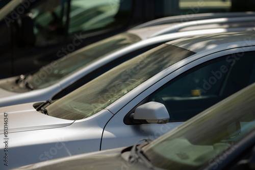 In a designated parking area, there are several parked silver cars that have dirty windshields, which illustrates the importance of proper automobile storage and regular vehicle maintenance