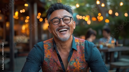 In a lively evening setting, this man with stylish glasses and gray hair is captured laughing heartily, dressed in a patterned shirt amidst glowing lights.
