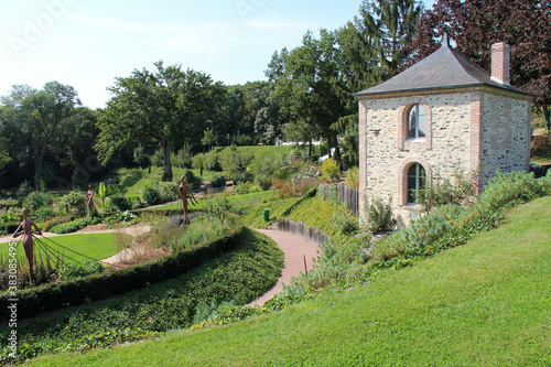 garden, park, france, nature, landscape, grass, plant, vegetation, tree, foliage, path, pavilion, architecture, building, roof, slate, facades, wall, stone, window, glasses, brick, french, travel