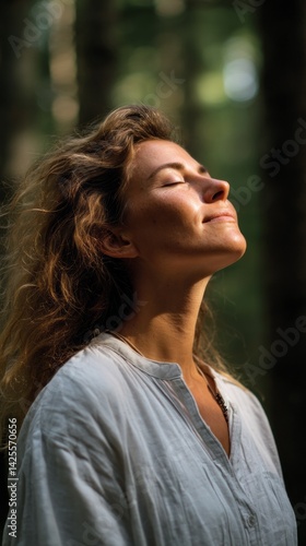 In a peaceful forest, a woman embodies calmness as she practices mindful breathing. Sunlight filters through the trees, illuminating her content expression amidst nature’s embrace
