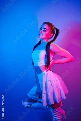 In skirt. Fashionable young woman standing in the studio with neon light
