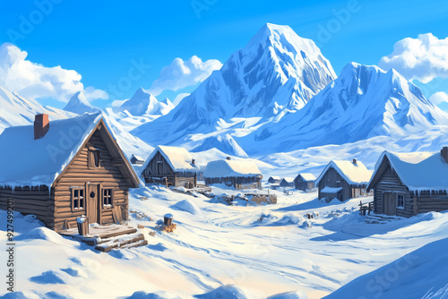 village, abandoned, wooden, house, ice, snow, mountain, towering, blue, sky, warm, tone, illustration, foreground, background, landscape, winter, cold, serene, peaceful, remote, isolated, picturesque, nature, scenery, glacé, wilderness, rustic, empty, barren, chill, tranquil, crisp, alpine, peak, frosty, untouched, desolate, clear, bright, calm, environment, scenic, solitude, huge, horizon, resort, swiss, holiday