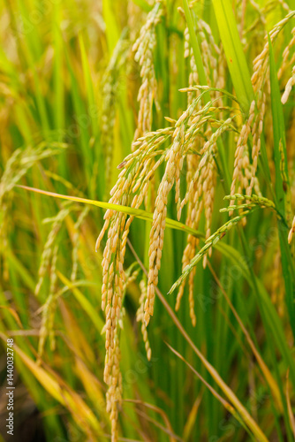 In the heart of the rice field, golden stalks bow under the weight of their full, ripe grains, ready for harvest.