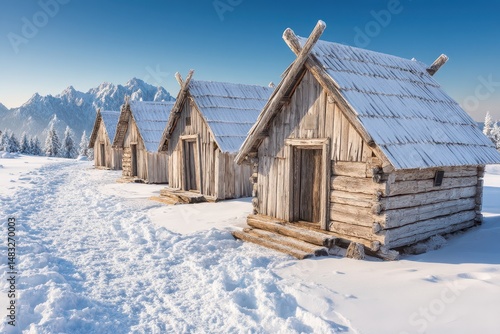 In the winter, Austrian mountains feature wooden houses surrounded by a significant amount of snow