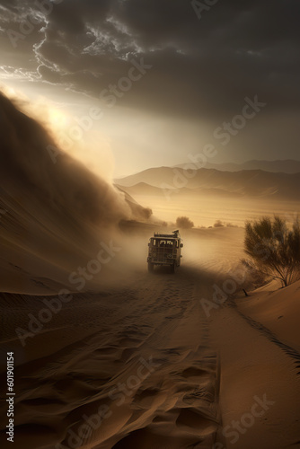 sandstorm, sand, dust, dune, mountain, desert, landscape, wind, sky, stormy, air, fog, land, scenery, road, car, highway, travel, sun, nature, cloud, jeep, adventure, cloud, sunrise, journey, driving, sunset, ia, generative