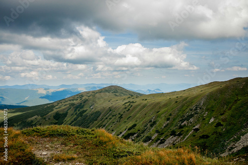 mountain, cloud, sky, picturesque, landscape, peak, hill, idylli, nature, view, forest, slope, mountain chain, hiking, grass, green, ridge, scenic, tree, healthy lifestyle, travel, summer, meadow, panorama, high, trekking, air, blue, flora, natural, rocky, tall, europa, mount, scenic, tour tourism, excursion, carpathians