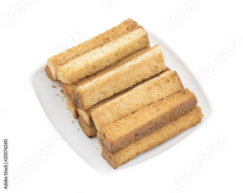 Indian Bakery Food Tea Time Sweet Dry Toast Snack Also Know As Indian Toast Snack, Toasted, Bread, Long Toast, Mawa Toast isolated on White Background