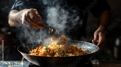Indian chef stir-fries hot Indian style chicken biryani and takes photos of food against a dark background.