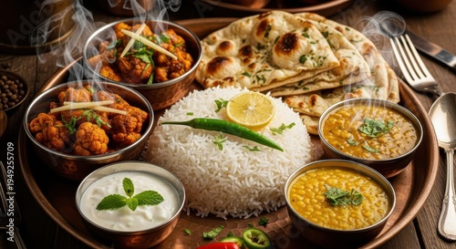 Indian cuisine platter with rice, naan bread, and various curries
