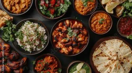 Indian food feast showcasing chicken tikka masala, tandoori chicken, and a variety of appetizers, laid out in traditional serving bowls. Vibrant, flavorful dishes.