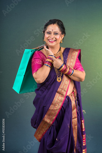 Indian Traditional woman holding and posing with shopping bags and showing somthing with hand