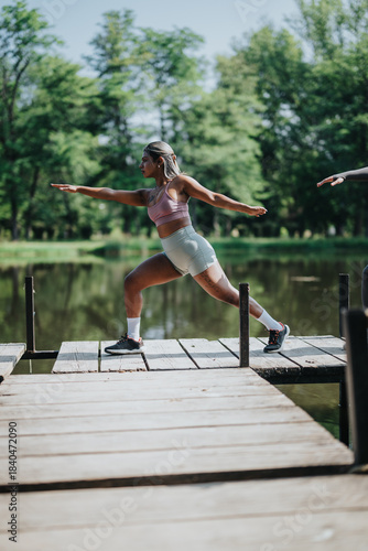 Indian woman practicing a yoga pose on a wooden dock by a scenic lake, promoting fitness and relaxation in nature. The image captures a serene atmosphere perfect for outdoor exercise.