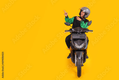 Indonesian Motorcycle Taxi Driver Pointing Aside On His Motorbike Isolated On Yellow Background