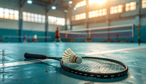 Indoor badminton court with racket and shuttlecock in foreground, players in background, warm sunlight through windows.