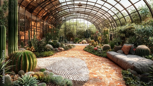 indoor, greenhouse, plant, cactus, succulent, flora, greenery, glasses, structure, nature, agriculture, design, environment, landscape, layout, botanical, dirtied, seating, pathway, warmth, sunlight, atmosphere, growth, arrangement, vibrant