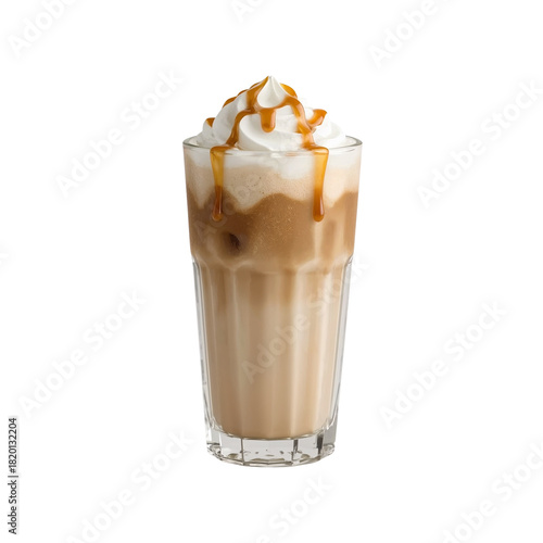 Indulgent caramel iced coffee creation showcasing decadent layers and textures isolated