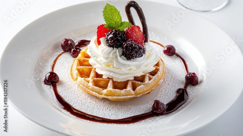 waffle, gold, whipped, cream, fresh, berry, raspberry, blackberry, mint, dessert, sweet, food, epicure, treat, chocolate, sauce, plate, elegant, serving, delicious, breakfast, brunch, pastry, confection, indulgent, presentation, culinary, rich, garnish, sugar, sprinkle, flavorful, classic, homemade, traditional, fluffy, crispy