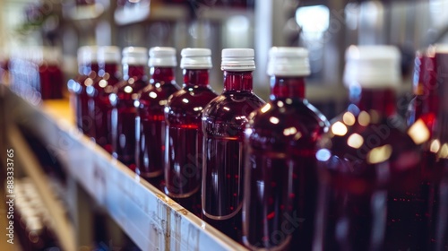 Industrial Bottling Process: Grape Juice Bottles on Manufacturing Line for Efficient Packaging