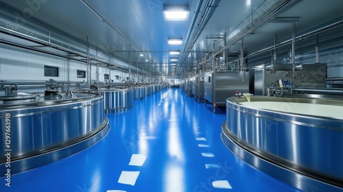 Industrial Dairy Processing Facility Interior with Stainless Steel Tanks and Blue Epoxy Floor Clean Modern Production Environment