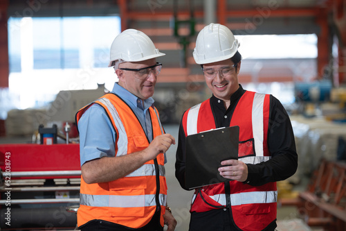 Industrial Engineers in Hard Hats Discuss New Project in factory . They Work in a Heavy Industry Manufacturing Factory.