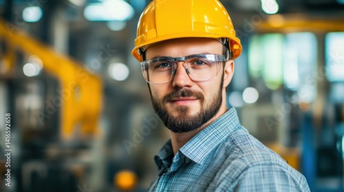 Industrial engineers with hard hats are employed in a heavy industry manufacturing facility. A worker is seen indoors in a factory. The concept of safety first is highlighted