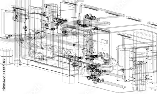 industrial equipment with piping in the factory. 3d rendeing wire frame