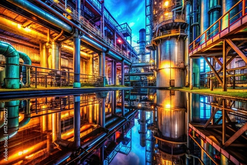 industrial, facility, water, closeup, high, depth, field, bokeh, pipe, machinery, metal, concrete, sunlight, steam, factory, industry, infrastructure, architecture, detail, texture, bright, clear, sharp, realistic, photorealistic, ai, generated, image, photo, digital, art, design, modern, industrial design, engineering, technology, manufacturing, equipment, steel, water surface, abstract, modern architecture, urban, city landscape