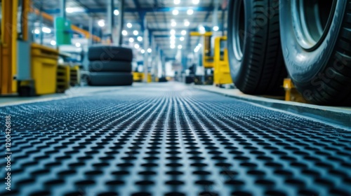 factory, industrial, tire, floor, manufacturing, production, wheel, conveyer, belt, rubber, matting, transportation, automotive, vehicle, industry, machinery, equipment, technology, workshop, plant, blue, dark, metal, steel, grid, perforated, heavy, truck, transport, logistic, business, commerce, workplace, engineering, assembly, line, system, process, background, texture, deep