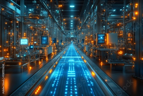 Industrial Factory Line with Electronic Devices and Luminous Objects Generative AI