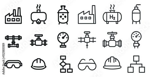 industrial, icon, collection, engineering, manufacturing, factory, equipment, machinery, gauge, valva, pipeline, helmet, safety, goggles, process, diagram, refinery, technology, gas, chemical, production, structure, system, industry, plant, work, tool, design, project