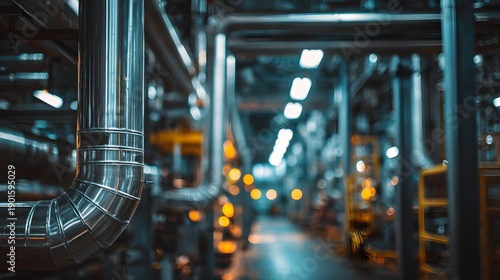 Industrial Interior with Shiny Metal Pipes and Blurred Background of Factory.