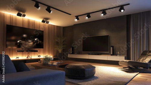 Industrial loft-style living room with exposed ceiling track lighting, featuring modern LED spotlights