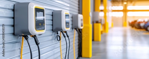 Industrial logistics center featuring a fast charging station with multiple electric vehicles connected and charging, providing ample space for text.