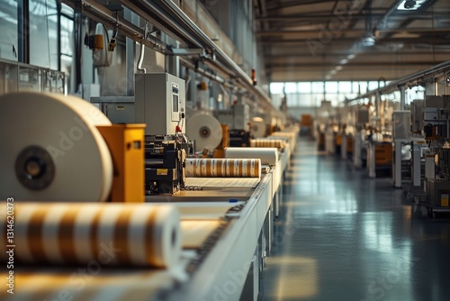 factory, industrial, manufacturing, production, conveyer belt, roller, machine, machinery, equipment, technology, process, industry, automation, assembly line, work, job, mass production, industrial building, metal, steel, white, grey, yellow, orange, beige, horizontal, long shot, daylight, sunlight, clean, shiny