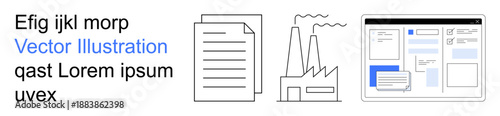 Industrial operations, business workflow, document analysis, digital platforms, data organization, web design. Factory, paper stack and webpage mockup in clean outlines. Industrial processes