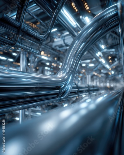 industrial, pipe, machinery, factory, metal, steel, tube, manufacturing, processing, equipment, construction, engineering, technology, modern, infrastructure, system, complex, precision, detail, light, blue, grey, reflective, smooth, high technology, interior, corridor, network, connection, flow, systematic, production, automation, process, piping, operation, technologic, efficient