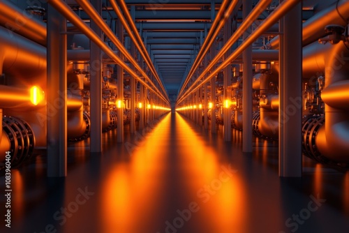 industrial, pipe, orange, light, infrastructure, manufacturing, technology, engineering, factory, tunnel, mechanical, metal, construction, system, process, design, interior, equipment, dim