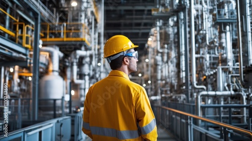Industrial polymer engineer managing large-scale production, monitoring efficiency and quality control in a bustling factory